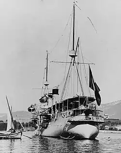 She remained with the Mediterranean Squadron the following year.[14] That year, the annual fleet maneuvers were conducted from 3 to 28 July. The ship was present for the exercises, but instead of taking an active role, she escorted the battleship Bouvet, which hosted the admiral in charge of supervising the maneuvers.[15] The ship continued to serve in the squadron through 1902.[16] During the 1902 fleet maneuvers, which began on 7 July, the Northern Squadron attempted to force a passage through the Strait of Gibraltar. The cruisers of the Mediterranean Squadron, including Galilée, conducted patrols from their base at Mers El Kébir to observe their entrance and signal the rest of the fleet. After successfully detecting the simulated enemy squadron, they shadowed the vessels until the rest of the Mediterranean Squadron assembled, but the Northern Squadron commander was able to shake his pursuers long enough to prevent them from intercepting his force before the end of the exercises on 15 July. Further maneuvers with the combined fleet took place, concluding on 5 August.[17]