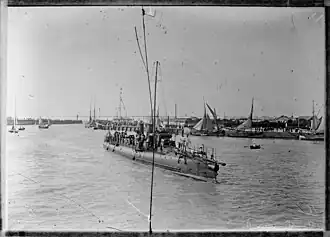 When the First World War began in August 1914, Durandal was one of the leaders (divisionnaire) in the 2nd Submarine Flotilla (2ère escadrille sous-marins) of the 2nd Light Squadron (2e escadre légère)[8] based at Cherbourg.[9] On 12 October, Durandal, the destroyer Escopette and the auxiliary cruiser Pas de Calais (a converted paddle packet ship), engaged the German submarine U-20 off Cap Gris-Nez.[10][11]