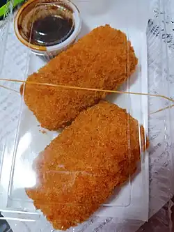 | Kani cream croquette | | Kani cream croquette, or Kani cream korokke, a Japanese take on the French croquette, consists of a creamy filling of crabmeat and béchamel sauce, coated in panko breadcrumbs and deep-fried, often made with imitation crab meat. |