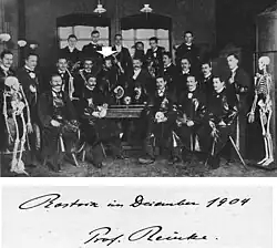 Reinke began his medical studies in 1883 at the University of Goettingen and the University of Kiel received his medical degree on 28 March 1891 with a specialization in anatomy. His doctoral thesis, Untersuchungen über das Verhältnis der von Arnold beschriebenen Kernformen zur Mitose und Amitose (Investigations into the relationship of the nuclear forms described by Arnold to mitosis and amitosis), was an in-depth study of cell division. Upon graduation, Reinke completed a 6-month internship at the Pathology Institute of the University of Zurich. There, he studied under Edwin Klebs. Reinke developed a collegial relationship with Otto Lubarsch, who at that time was an assistant in the Institute. On completion of his internship, Reinke served as a ship's doctor on the passenger liner Weiland bound for Brazil where he visited some members of his family.[7] He returned to Germany in 1893 to complete a second internship as a junior physician in Dahmen, Mecklenburg.[8] Subsequently, Professor Albert von Brunn offered Reinke the position of first demonstrator at the Anatomical Institute of the University of Rostock, perhaps through the intercession of Dr Lubarsch. There he achieved his habilitation, or Venia Legendi, a postdoctoral qualification common to many European academic systems that entitles the holder to supervise doctoral candidates and is thus essential for an academic career. His habilitation thesis, reviewed and defended before committee, was entitled Zellstudien (Cellular Studies), an investigation of the cell structure in the germ layer of the human skin.[9] Specifically, he investigated leukocytes, the cells of the conjunctive tissue, collagenous and elastic fibers, pigment, and cell differentiation.