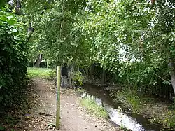 ![]() Frog Park in 2011, showing the reconstituted creek filled by water pumped up from the culvert below. | |