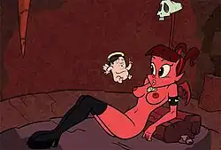 Black viewed John Kricfalusi's website and, after watching The Ren & Stimpy Show, decided to ask him to produce the video.[1] The total costs amounted to $40,000.[1] The video was animated by John Kricfalusi's studio Spümcø. Gabe Swarr directed and co-wrote the video.[2] Ben Jones was the layout artist and Derrick Wyatt designed the characters.[3] It features cartoon versions of band members Jack Black and Kyle Gass as nude cherubim sent from Heaven to teach the Devil, who'd been having frantic sex with a female devil, to be loving in his relations with women. While at first concisely taking notes, Devil becomes enraged when he realizes that the cherubim are now pleasuring the she-devil instead, and moves to attack them.