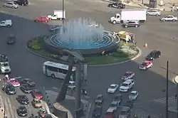 During the planning of the installation of Puerta 1808, Manuel Felguérez used the space to conceptualize how to place it on the corner of Paseo de la Reforma and Avenida Juárez. He mentioned that, at that time, there was only a traffic circle with poorly maintained grass and commented to his team that a fountain could improve the view; the roundabout replaced the Glorieta del Caballito, whose main sculpture was removed in 1979. He suggested it not be too high to avoid taking attention away from all the visible monuments in the area. On the day Puerta 1808 was inaugurated (20 October 2007), Felguérez hinted to Marcelo Ebrard, the head of government, that a fountain would be a good way to decorate the space, and he approved it.[1] Felguérez designed it in situ with the Monumento a la Revolución as a visual reference. The jets of water it would spurt would take the shape of the monument, with high curves in the center and tapering curves at the sides.[1] These reach 2 meters (6 ft 7 in) in height.[2] Juan Álvarez del Castillo was chosen as the architect. The concrete fountain[3] is coated with carbon steel;[1] it is 20 m (66 ft) in diameter, has 700 water jets, 200 lamps and eight pumps that move 100 cubic meters (3,500 cu ft) of recycled water.[4] Felguérez said that the fountain is different from others because instead of having a sculpture in the center, the fountain itself is the sculpture.[1] On the border two red circles are painted to represent the eyes of Mexico.[1][5] The fountain was inaugurated on 13 December 2007 for the celebrations of the 200th anniversary of the country's independence in 2010.[2]