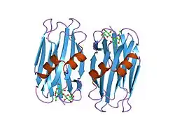 In molecular biology, the fungal fruit body lectin family consists of several fungal fruit body lectin proteins. Fruit body lectins are thought to have insecticidal activity [1] and may also function in capturing nematodes.[2] One member of this family, the lectin XCL from Boletus chrysenteron (formerly Xerocomus chrysenteron), induces drastic changes in the actin cytoskeleton after sugar binding at the cell surface and internalisation, and has potent insecticidal activity. The fold of lectin XCL is not related to any of several other lectin folds, but shows significant structural similarity to cytolysins.[3]
