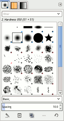 There are several ways of selecting colors, including palettes, color choosers and using an eyedropper tool to select a color on the canvas. The built-in color choosers include RGB/HSV/LAB/LCH selector or scales, water-color selector, CMYK selector and a color-wheel selector. Colors can also be selected using hexadecimal color codes, as used in HTML color selection. GIMP has native support for indexed color and RGB color spaces; other color spaces are supported using decomposition, where each channel of the new color space becomes a black-and-white image. CMYK, LAB and HSV (hue, saturation, value) are supported this way.[41][42] Color blending can be achieved using the Blend tool, by applying a gradient to the surface of an image and using GIMP's color modes. Gradients are also integrated into tools such as the brush tool, when the user paints this way the output color slowly changes. There are a number of default gradients included with GIMP; a user can also create custom gradients with tools provided. Gradient plug-ins are also available.