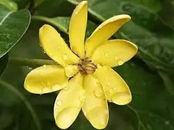 Gardenia tubifera, also called golden gardenia, is a species of flowering small tree in the family Rubiaceae, native to Asia. It is a small tree, growing to a height of 2–4 m (6–12 ft) high with a spread of 1–2 m (3–6 ft). It prefers tropical conditions and will not tolerate temperatures below freezing.