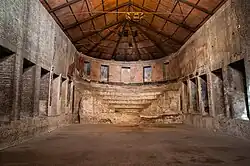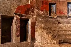 The interior wall sports seventeen niches, five along the apse and six on either side, decorated with naturalistic frescos depicting landscapes and gardens.[37] However, their correlation to the Pompeian Third Style of Roman painting makes this decoration a likely product of later renovations done by Tiberius.[38] Painting motifs evocative of the Dionysian Mysteries, such as drunken processional scenes with thyrsi and maenads prominent, match the early imperial fascination with cult initiation rites.[39]