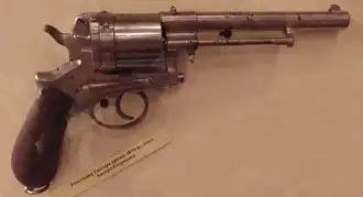 The Gasser M1870 was a revolver chambered for 11.3×36mmR and was adopted by the Austro-Hungarian cavalry in 1870. It was an open-frame model, with the barrel unit attached to the frame by a screw beneath the cylinder arbor. The arbor pin was screwed into the barrel unit and fitted into a recess in the standing breech. The cylinder was gate-loaded from the right side, and a rod ejector was carried beneath the barrel. A unique safety bar will usually be found on the right of the frame, below the cylinder. This carries pins which pass through holes in the frame to engage the lock mechanism. Slightly retracting the hammer allows one of these pins to move inward, preventing the hammer moving forward again when released. The pistol can thereafter be carried safely when loaded. Pressure on the trigger withdraws the pin from the path of the hammer before firing. The M1870 Gasser became the Austro-Hungarian cavalry revolver. It chambered a long 11.25 millimetres (0.443 in) centerfire cartridge which had earlier been used in Fruwirth carbines.[1][2][3]