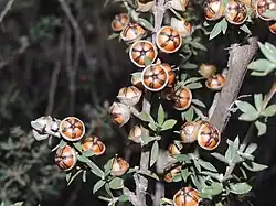 Silver tea-tree grows in woodland and on dry hillsides south from the Bathurst district in New South Wales through the Australian Capital Territory to northern Victoria.[2][3][4]