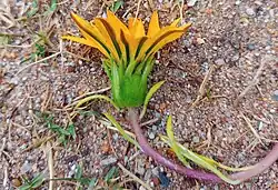 The flowerheads have yellow rays (sometimes orange). Like most gazanias, the ray undersides usually have dark stripes. The petioles are sometimes ciliate. The involucre is smooth (glabrous) and campanulate, with an obtuse base (sometimes subintruse). The outer involucre bracts have ciliate margins with spinules; The inner involucre bracts have entire, membranous margins. [2]