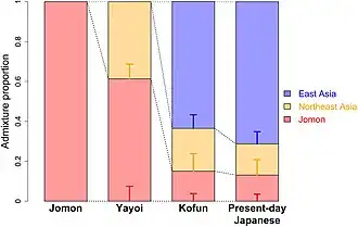 In 2018, an independent research conducted by director Kenichi Shinoda [ja] (篠田 謙一) and his team at National Museum of Nature and Science was broadcast on NHK Science ZERO and it was discovered that the modern day Japanese are genetically extremely close to the modern day Koreans.[37] A genome study (Takahashi et al. 2019) shows that modern Japanese (Yamato) do not have much Jōmon ancestry at all. Nuclear genome analysis of Jōmon samples and modern Japanese samples show strong differences.[38] Various studies estimate the proportion of Jōmon ancestry in Japanese people at around 9-13%, with the remainder derived from later migrations from Asia including the Yayoi people.[36][39][40]