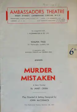 Murder Mistaken is a 1952 thriller play by the British author Janet Green. It first appeared at the Prince of Wales Theatre in Cardiff under the title Teddy Bare's Picnic. It then transferred to London's West End under its new title first at the Ambassadors Theatre and then at the Vaudeville Theatre. It's West End run lasted 156 performances between 4 November 1952 and 28 March 1953.[1] The West End cast included Derek Farr, Anthony Marlowe, Phyllis Morris, Iris Hoey, Brenda de Banzie, Patricia Burke and Rosalie Crutchley. It appeared on Broadway under the alternative title Gently Does It, lasting for thirty seven performances at the Playhouse Theatre.[2] Green wrote a novelisation in 1953 with Leonard Gribble.[3]