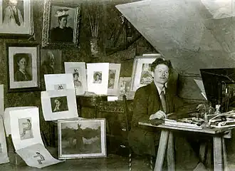 At the age of fourteen, he followed them into that profession, During his years at the manufactory (1883-1888), his talents were recognized and he was awarded a scholarship to attend the Dresden Academy of Fine Arts. There, he studied with the portrait painter, Leon Pohle. He left the Academy in 1890; completing his studies at the Grand-Ducal Saxon Art School, Weimar, with Professor Max Thedy, a noted portrait and interior painter. For several years, he worked as an itinerant illustrator and portraitist in Berlin, Leipzig, and Munich. In 1897, he settled in Loschwitz, a suburb of Dresden.