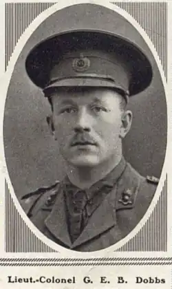 George Eric Burroughs Dobbs (21 July 1884 โ€“ 17 June 1917) was an Irish-born international rugby union player for England (2 caps as a flanker in the 1906 Home Nations Championship[1]), and served with the British Army from 1904. He served during the First World War, and was promoted to lieutenant colonel. He was killed at Poperinge in 1917 while surveying a cable trench when a stray artillery shell fatally wounded him. He died of wounds later that day.[2]