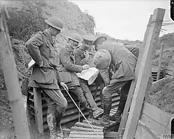 ![]() Carey with other officers in a trench in front of Lievin, 14 May 1918 | |