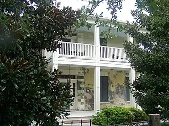 The three-bay south façade has a double gallery, which is not original to the house. The gallery was altered or expanded three times during the twentieth century.[27] In the current configuration, the galleries are accessible from the interior of both stories via doors on the western ends of the south facade. The first-story door, with an architrave featuring colored glass, pilasters, sidelights, and a transom, serves as the house's primary entrance. The lintels of the windows on the south facade have stucco scored to simulate heavy keystones. The sills, original to the house, are made of white Vermont marble.[28]