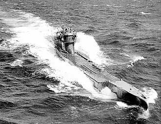 The submarine had a maximum surface speed of 17.7 knots (32.8 km/h; 20.4 mph) and a maximum submerged speed of 7.6 knots (14.1 km/h; 8.7 mph).[3] When submerged, the boat could operate for 80 nautical miles (150 km; 92 mi) at 4 knots (7.4 km/h; 4.6 mph); when surfaced, she could travel 8,500 nautical miles (15,700 km; 9,800 mi) at 10 knots (19 km/h; 12 mph). U-278 was fitted with five 53.3 cm (21 in) torpedo tubes (four fitted at the bow and one at the stern), fourteen torpedoes, one 8.8 cm (3.46 in) SK C/35 naval gun, 220 rounds, and two twin 2 cm (0.79 in) C/30 anti-aircraft guns. The boat had a complement of between forty-four and sixty.[3]