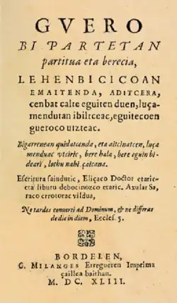 It was published in Bordeaux in 1643 under the patronage of Bertrand D'Etchauz, the Basque archbishop of Tours (1617-1641). The book was written after the period of the harrowing "witch" persecution (Pierre de Lancre's intervention in Labourd). While the title's tagline reads "divided into two parts", only the existence of one book has been attested. Basque scholar Pierre Lafitte claimed that both parts had been merged into one. By contrast, former president of the Basque Language Academy Luis Villasante held that the second part had been actually lost.[3]