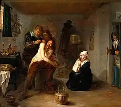 His genre scenes often represent peasants and persons from the lower as well as middle classes enjoying a good time at taverns.[1] He painted about a dozen wedding parties.[11] He further painted more unusual subjects, such as scenes with surgeons performing operations and views of the fire that destroyed the old town hall of Amsterdam on 7 July 1652 (one version in the Amsterdam Museum).[1] He painted a view of the Fair at the Heiligwegpoort in Amsterdam (at the Amsterdam Museum), which shows, amongst the festive fair, a fight of dogs (so-called 'berebijters' (bear biters') against a bear.[12][13] Since Lundens did not vary the handling of his genre scenes substantially over time, it is difficult to date these works.[11]