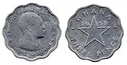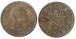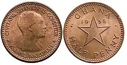 | 1⁄2d | Kwame Nkrumah (Lettering:) CIVITATIS GHANIENSIS CONDITOR (the Founder of Ghana) KWAME NKRUMAH | Five-pointed star (Lettering:) GHANA 1958 & The value of the coin | Bronze | 2.9 g | 21 mm | Smooth | 1 July 1958 | |