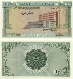The pound was the currency of Ghana between 1958 and 1965. It was subdivided into 20 shillings, each of 12 pence. Until 1958, Ghana used the British West African pound, after which it issued its own currency. In 1965, Ghana introduced the first cedi at a rate of £1 = ₵2.40, i.e., ₵1 = 100d.