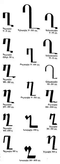 Ghat, Ghad, or Ġat (majuscule: Ղ; minuscule: ղ; Armenian: ղադ) is the eighteenth letter of the Armenian alphabet. It represents the voiced uvular fricative (/ʁ/) in both Eastern and Western varieties of Armenian. In Classical Armenian, it is pronounced as the velarized alveolar lateral approximant (/ɫ/). Created by Mesrop Mashtots in the 5th century, it has a numerical value of 90.[1]