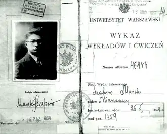 The 1934 Index of a Polish-Jewish student at the Warsaw University Department of Medicine, with a stamp reading: Miejsce w ławkach nieparzystych (Seating in benches with an odd number) | |