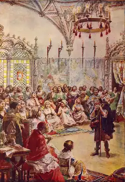 In 1493, he was acting as master of rhetoric to the Duke of Beja, afterwards King Manuel, a post which gave him admission to the court.[8] His first known work, O Monólogo do vaqueiro ("Monologue of the Cowherd"), was written in Spanish and acted in the rooms of Maria of Aragon, wife of King Manuel, to celebrate the birth of Prince John (later John III of Portugal). The first performance, recited by the playwright himself, took place on the night of 8 June 1502, in the presence of the king; the queen; Leonor of Viseu, former Queen of Portugal and widow of John II; and Beatriz of Portugal, mother of the King.
