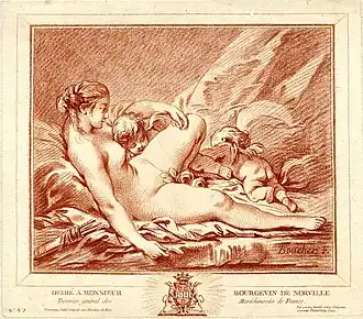 His reproductive works were mainly made after the works of Charles-André van Loo, Jean-Baptiste Huet, Charles-Nicolas Cochin, Antoine Watteau and most frequently François Boucher. Half of his works were made after drawings by François Boucher or after drawings owned by collectors such as the family Blondel d’Azincourt.[7] Painters of the 18th century were accustomed, before beginning a painting, to make sketches in sanguine. They regularly executed these sketches with pencils of different colors. The crayon manner of engraving allowed engravers like Gilles Demarteau to produce faithful reproductions of these designs. These prints in red ink so much resembled red chalk drawings that they could be framed as little pictures. They could then be hung in the small blank spaces of the elaborately decorated paneling of homes.[11]