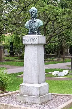 Krog died on 14 April 1916, during an influenza epidemic.[1] She was the first woman in Norway to be honoured with a funeral at public expense. Several female university graduates provided a guard of honour, and the Norwegian mezzo-soprano Bergljot Bjørnson sang.[3] Krog's funeral was attended by the Prime Minister, the President of the Storting, and the Chief Justice of the Supreme Court.[1] A bronze bust of Krog, sculpted by Ambrosia Tønnesen in 1919, is located at her grave at Vår Frelsers gravlund in Oslo.[17]