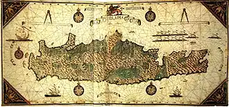 It was signed in a cartouche Giorgi Callapoda a Candia faciebat, and dated 1541; the coat-of-arms in the map shows that it was made for the Venetian commander of galleys Francesco Zeno the elder, a member of the noble Venetian family of Zeno.