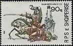In Albanian folklore, Gjergj Elez Alia is regarded as a great warrior and his legend is one of the most popular. A song of Gjergj Elez Alia was recorded by Bernardin Palaj and Donat Kurti in Nikaj (Tropojë District) and published in Tirana in 1937.[27] The song is usually sung accompanied by the lahuta (gusle), or occasionally with çifteli, by the rapsod (performer of epic poetry).[28] The song of Gjergj Elez Alia is part of the heroic non-historical cycle of Albanian epic poetry, the Kângë Kreshnikësh ("Songs of Heroes"), however it is not related to the epic cycle of the pair of heroic brothers Muji and Halili.[29]