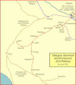 The Glasgow, Barrhead and Kilmarnock Joint Railway was a railway jointly owned by the Caledonian Railway and the Glasgow and South Western Railway, completed in 1873, and giving the latter a shorter access to its Carlisle main line. A branch to Beith was also built.