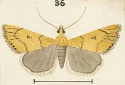 Meyrick stated that this species was distinctive as it has uniformly deep yellow forewings and a double black dot representing the discal spot and has grey hind-wings.[4] Hudson stated that the brown transverse lines are sometimes almost absent and the position of the second line is indicated by a series of short, longitudinal metallic bars. Apart from the very distinct character of the discal spot, this insect might be mistaken for a plain yellow variety of Glaucocharis lepidella.[5]