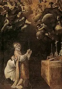 The painting depicts events on 10 November 1608 just before the death of the priest and Theatine preacher Andrea Avellino. As he began to celebrate the miracle of the Eucharist, he was stricken with apoplexy (stroke) and would soon after die. The depiction shows an assistant aiding him to stand as the heavens and angels open up above, prefiguring his sanctity. The depiction of the lower figures were completed by Lanfranco putatively in 8 days in order to be complete for his beatification by Pope Urban VIII in 1624. It is stated that the glory of angels were added in the mid-1600s by Antonio Amorosi. The canvas originally was taller, and the superior arch of it was detached in the 19th century when the altar was rebuilt.[1]