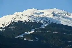 The Glungezer (high peak in centre of photo) and Sonnenspitze (high peak right of centre, w/ less snow coverage) seen from Innsbruck. Left foreground: the Bärenbader Jöchl, right: the Neunerspitze (2,285 m)