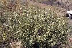 Goodenia chambersii is an ascending shrub that typically grows to a height of 50 cm (20 in) and has somewhat sticky foliage. The leaves are broadly egg-shaped to round, toothed, 15–30 mm (0.59–1.18 in) long and 10–30 mm (0.39–1.18 in) wide on a petiole up to 15 mm (0.59 in) long. The flowers are arranged in racemes or thyrses up to 200 mm (7.9 in) long on a peduncle 2–5 mm (0.079–0.197 in) long with linear bracteoles 5–7 mm (0.20–0.28 in) long at the base, each flower on a pedicel 5–10 mm (0.20–0.39 in) long. The sepals are lance-shaped, 5–6 mm (0.20–0.24 in) long and the petals are yellow and 18–25 mm (0.71–0.98 in) long. The lower lobes of the corolla are about 10 mm (0.39 in) long with wings about 1.5 mm (0.059 in) wide. Flowering occurs from September to October and the fruit is an oval capsule about 12 mm (0.47 in) long.[2][3]