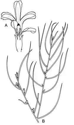 Goodenia disperma is an erect undershrub with few branches and that typically grows to a height of 30 cm (12 in). The leaves are linear and arranged on the stem, 3–50 mm (0.12–1.97 in) long and 1.5–2 mm (0.059–0.079 in) wide. The flowers are arranged in racemes up to 150 mm (5.9 in) long with leaf-like bracts at the base, each flower on a pedicel 1–2 mm (0.039–0.079 in) long. The sepals are linear to lance-shaped with the narrower end towards the base, 4–5 mm (0.16–0.20 in) long and the corolla is white and about 9 mm (0.35 in) long. The lower lobes of the corolla are 3–5 mm (0.12–0.20 in) long with wings about 0.5 mm (0.020 in) wide. Flowering occurs from November to May and the fruit is an oval capsule about 8 mm (0.31 in) long.[2]