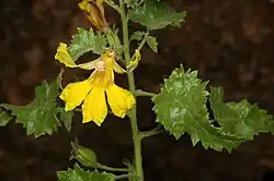 Goodenia kingiana is an erect shrub that typically grows to a height of 1.5 m (4 ft 11 in) long and is covered with sticky glandular hairs. The leaves are lyre-shaped to pinnatifid, the end leaflet egg-shaped, heart-shaped or toothed, 20–40 mm (0.79–1.57 in) long and 10–25 mm (0.39–0.98 in) wide. The petiole is 30–70 mm (1.2–2.8 in) long and the side leaflets egg-shaped to linear. The flowers are arranged in racemes or thyrses up to 120 mm (4.7 in) long with leaf-like bracts, each flower on a pedicel 15–20 mm (0.59–0.79 in) long. The sepals are lance-shaped, 4–5 mm (0.16–0.20 in) long, the corolla yellow and 25–30 mm (0.98–1.18 in) long. The lower lobes of the corolla are 14–16 mm (0.55–0.63 in) long with wings 3–4 mm (0.12–0.16 in) wide. Flowering occurs from July to October and the fruit is an oval capsule about 8 mm (0.31 in) long.[2][3][4]