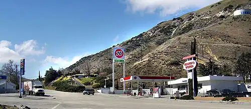 The Ridge Route road through Gorman was paved in 1919. In 1923, the first gasoline station in California to be located away from a railroad track was established by Standard Oil.[4] Gorman was a stop on the Ridge Route, and Highway 99 after 1926, where its Standard service station beckoned travelers. It was a rest stop for the Greyhound bus until 1977, and for long-distance truckers.