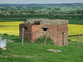 There are few remaining physical examples of Gotham's wartime past. The word Gotham was removed from the face of the school building and from all signs and direction posts during the Second World War to confuse any enemy troops that may have invaded. The pillbox pictured is the only remaining structure dating from the Second World War in the village. It was one of two pillboxes erected to form a defence for the village and also to serve as a searchlight battery. The damage to the pillbox was caused after the war and was not due to enemy action.[7] On 31 December 2018, a horse had to be rescued by the fire service after becoming trapped in the pillbox.[8]