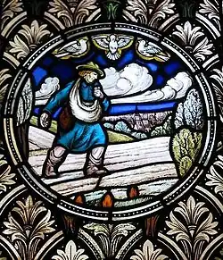 The equally artistic stained-glass windows from 1909 in the vestibule show fishermen in the Gröbener Kietz neighbourhood on the right and, according to the text in the window, a "Gröbener owner" in the field on the left.[11]