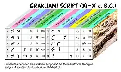 Georgian linguist Kukuri Pipia proposed a deciphering scheme for the Grakliani script, highlighting its resemblance to the three Georgian scripts: Asomtavruli, Nuskhuri, and Mkhedruli.[10]