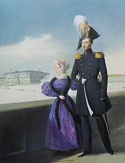 The wedding took place on 2 July 1839 at the grand church of the Winter Palace.[8] The ceremony was described in detail by the Marquis de Custine, who visited St Peterburg at that time. He praised the Grand Duchess for her grace, but disliked the Duke of Leuchtenberg.[9] Nicholas I spared no expense for his daughter's wedding and the festivities lasted for two weeks.[9] The couple remained in Russia, where their seven children grew up in the circle of the imperial family.