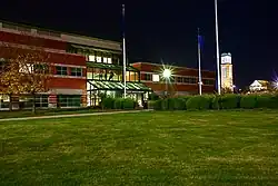 The 65-acre (260,000 m2) Robert C. Pew Grand Rapids campus is in the heart of downtown Grand Rapids on the banks of the Grand River.[28][30][29] It consists of 11 buildings and three leased spaces and includes the Richard DeVos Center, L.V. Eberhard Center, L. William Seidman Center, Beckering Family Carillon Tower, The Depot (houses the Michigan Small Business and Technology Development headquarters), Hauenstein Center for Presidential Studies, Keller Engineering Laboratories, John C. Kennedy Hall of Engineering, Peter F. Secchia Hall (housing), Winter Hall (housing), and the Van Andel Global Trade Center. Winter Hall is typically occupied by graduate students and is fully furnished along with appliances. These facilities include 57 classrooms, 78 research laboratories, 23 lab prep rooms, 11 computer labs, and the Steelcase Library.[30] The Steelcase Library was renovated in the Summer of 2025 to include a University Testing Center and Psychology Lab.