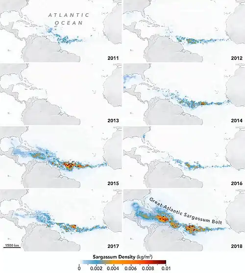 - ^ Schell, Jeffrey; Goodwin, Deborah; Siuda, Amy (September 1, 2015). "Recent Sargassum Inundation Events in the Caribbean: Shipboard Observations Reveal Dominance of a Previously Rare Form". Oceanography. 28 (3): 8–10. doi:10.5670/oceanog.2015.70. ISSN 1042-8275.