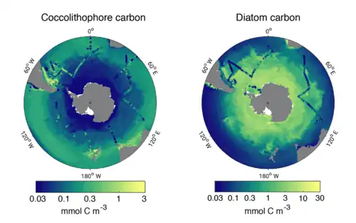 - ^ a b c d e f g h Nissen, Cara; Vogt, Meike; Münnich, Matthias; Gruber, Nicolas; Haumann, F. Alexander (2018). "Factors controlling coccolithophore biogeography in the Southern Ocean". Biogeosciences. 15 (22): 6997–7024. Bibcode:2018BGeo...15.6997N. doi:10.5194/bg-15-6997-2018. hdl:20.500.11850/304764. S2CID 203137081.