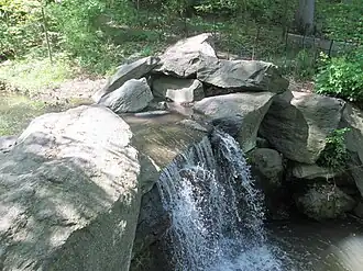 The Loch originates at the Pool before winding through the North Woods and the Ravine.[37] Its name is likely influenced from the trips that Central Park designer Frederick Law Olmsted made to the United Kingdom during the 1850s.[5]: 29 The Loch, formerly an actual lake, was whittled down over time into a small stream.[41] Originally, there were two waterfalls on the Loch: a 13.5 ft (4.1 m) drop at the Pool, and a smaller 9.5 ft (2.9 m) drop further east.[56]: 82 (PDF p. 86) [22] Paths also lined either bank of the Loch. A diverse selection of plant species was located along the Loch, though before the 1990s restoration, this had been reduced to a few invasive species.[22] The Loch then travels under the Huddlestone Arch, passing by the Davis Center to the east before draining into the Harlem Meer.[38] Prior to the reconstruction of the area in the early 2020s, the stream originally ran through a culvert under the previous Lasker Rink facility before emptying into the Meer.[37] The tall-grass meadow adjacent to the Loch is the park's only woodland meadow.[6]: 140