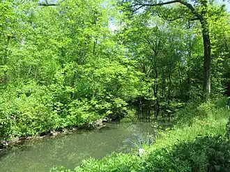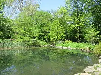North Woods is the largest of Central Park's three woodlands, and is located at the lightly-used northwestern corner of Central Park.[37][1]: 37 [38]: The Loch [39][40] It covers about 90 acres (36 ha) adjacent to North Meadow.[1]: 37–38 [28][41] The name sometimes also applies to other attractions in the park's northern end; if these adjacent features are included, the area of North Woods can be 200 acres (81 ha).[28] North Woods contains the 55-acre (22 ha) Ravine, a forest with deciduous trees on its northwestern slope, as well as the Loch, a small stream that winds through North Woods diagonally.[40][1]: 39 [42] The southeastern part of the Ravine contains oak, elms, and maple trees, while the area further east contains oak, hickory, maple, and ash trees.[41] The Woods also includes Blockhouse No. 1,[37] a historic fortification from the War of 1812.[39]