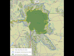 Yellowstone National Park boundaries were drawn in 1872 with the intent to include all the known geothermal basins in the region.[3] As landscape ecology considerations were not incorporated into original boundary, revisions were suggested to conform more closely to natural topographic features, such as the ridgeline of the Absaroka Range along the east boundary. In 1929, President Hoover signed the first bill changing the park's boundaries: The northwest corner now included a significant area of petrified trees; the northeast corner was defined by the watershed of Pebble Creek; the eastern boundary included the headwaters of the Lamar River and part of the watershed of the Yellowstone River. In 1932, President Hoover issued an executive order that added more than 7,000 acres (2,800 ha) between the north boundary and the Yellowstone River, west of Gardiner. These lands provided winter range for elk and other ungulates.[4] By the 1970s, the grizzly bear's (Ursus arctos) range in and near the park became the first informal minimum boundary of a theoretical "Greater Yellowstone Ecosystem" that included at least 4,000,000 acres (16,000 km2). Since then, definitions of the greater ecosystem's size have steadily grown larger. A 1994 study listed the size as 19,000,000 acres (76,890 km2), while a 1994 speech by a Greater Yellowstone Coalition leader enlarged that to 20,000,000 acres (80,000 km2).